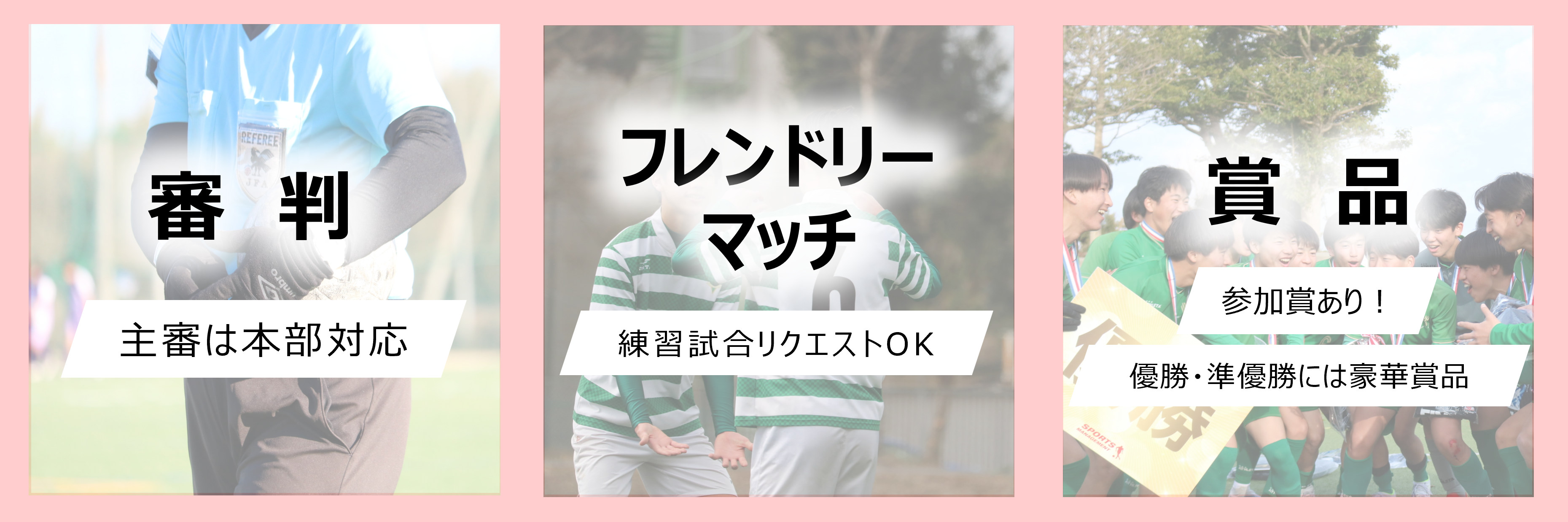 ●予選リーグ:3チーム総当たりリーグ戦 ●順 位 別 戦:リーグ戦 or トーナメント戦 ※敗者戦あり(各チーム1日2試合確保) ※試合方法は最終的な参加チームにより多少変更する場合があります。 ※公式戦以外のフレンドリーマッチも承ります。 |